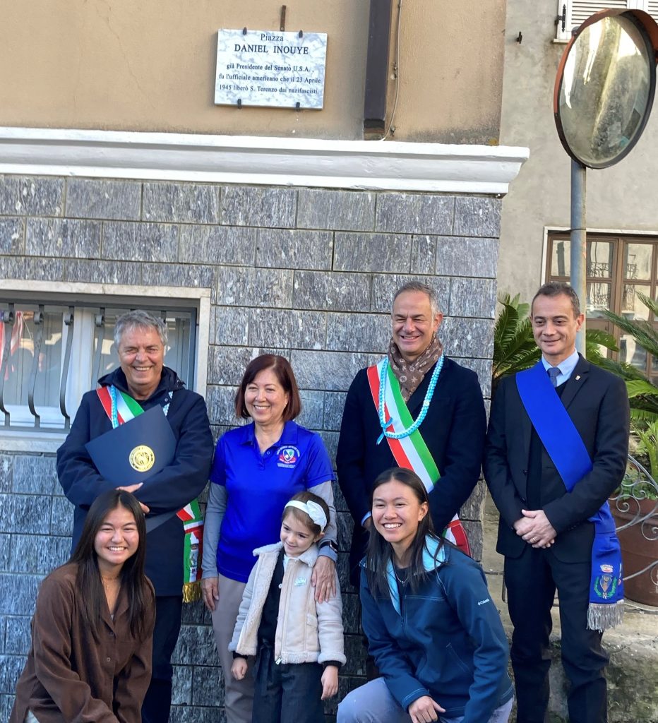 Eight Club 100 descendants and spouses joined a parallel “Shadow Tour” to participate in the historic renaming of a public square in San Terenzo Monti, Italy, as “Daniel K. Inouye Piazza,” honoring the site where the future U.S. Senator lost his arm in combat while liberating the village.